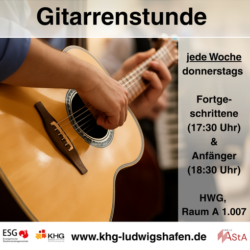 Donnerstag, 19.03.2026 Uhrzeit: 17.30 - 18.30 HWG, Raum A 1.007LU | Gitarrenstunde Fortgeschritten
